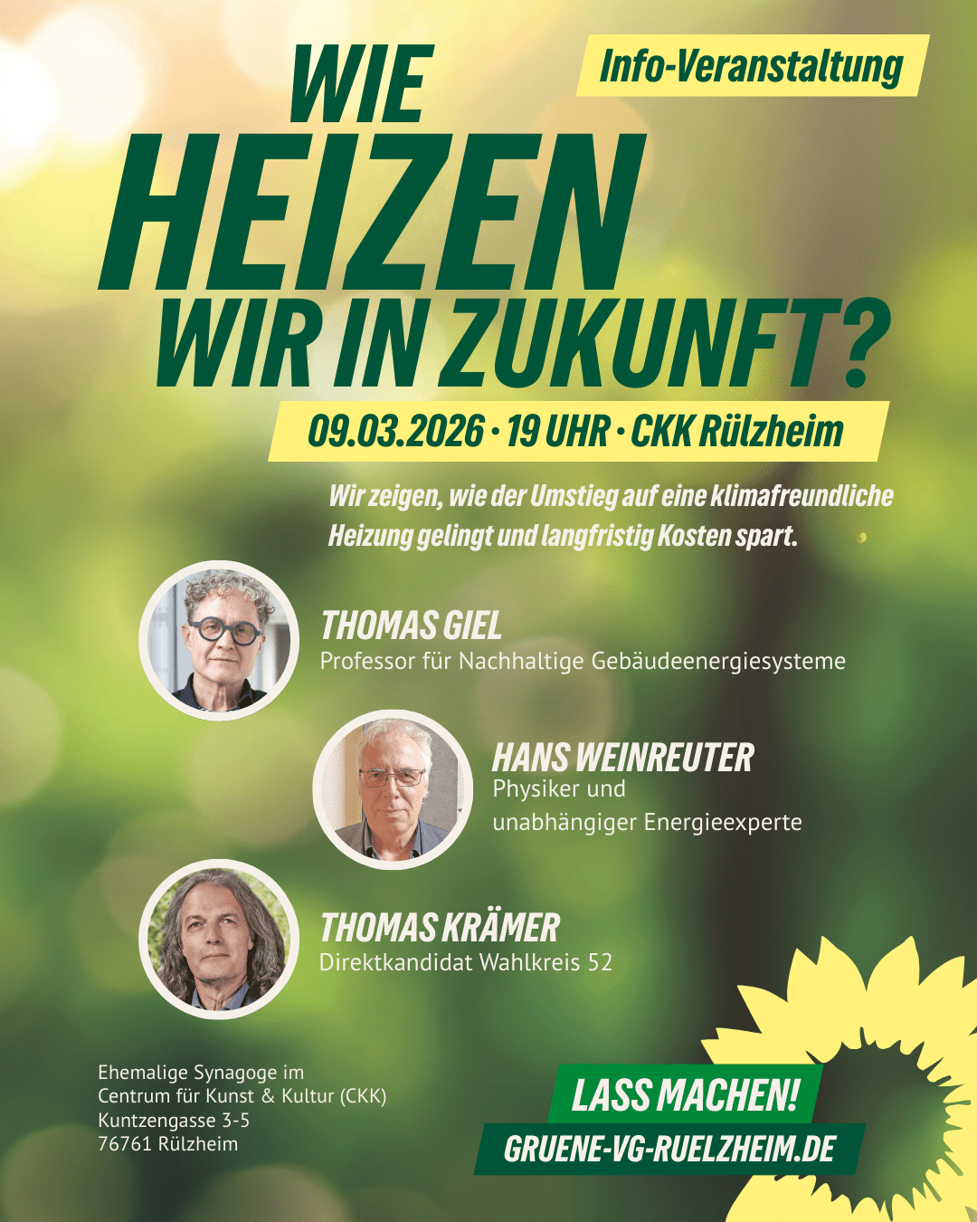 Der Ortsverband Rülzheim lädt alle interessierten Bürgerinnen und Bürger zur öffentlichen Informationsveranstaltung „Wie heizen wir in Zukunft?“ am Montag, 9. März 2026 ab 19 Uhr in der ehem. Synagoge (CKK), Kuntzengasse 3-5. Unsere Referenten Thomas Giel, Professor für Nachhaltige Gebäudeenergiesysteme an der Hochschule Mainz, und Hans Weinreuter, unabhängiger Energieexperte, zeigen, wie der Umstieg auf eine klimafreundliche Heizung gelingt und langfristig Kosten spart.